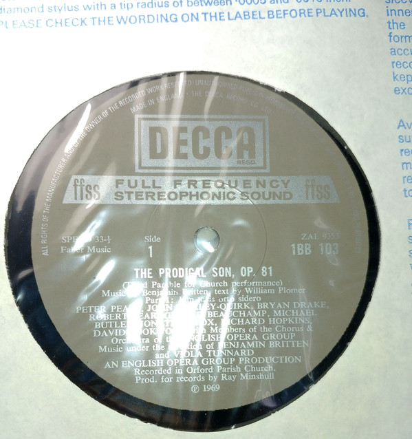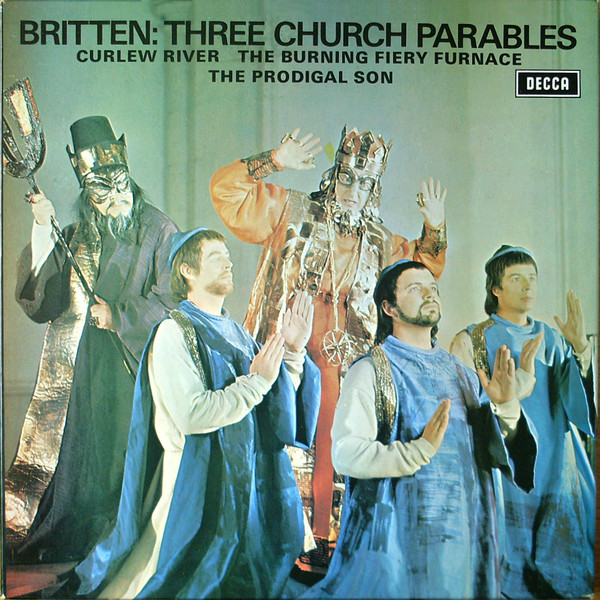 Decca box set comprising three previously released single albums: Curlew River (this edition ZAL 7020 – â„— 1966), The Burning Fiery Furnace, Op. 77 (ZAL 7971 – â„— 1967) and The Prodigal Son, Op. 81 (ZAL 9354 – â„— 1969). All albums supplied in box without original outer sleeve and in blue-printed ‘Stereo’ poly/paper inner sleeves. Separate notes/libretti booklets (each marked 1 BB 101) included for each title.
