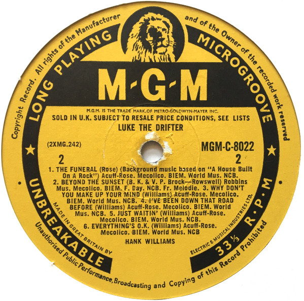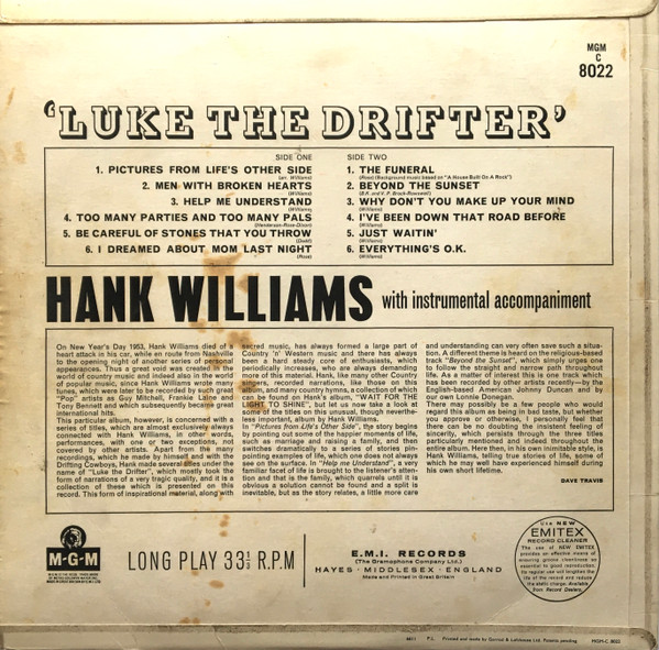 Hank Williams – Luke The Drifter – Vinyl Record NM/NM (Pre Loved)