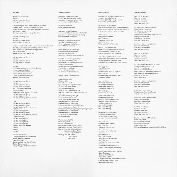 Included lyric inner sleeve, made of card on early pressings, paper on later pressings.