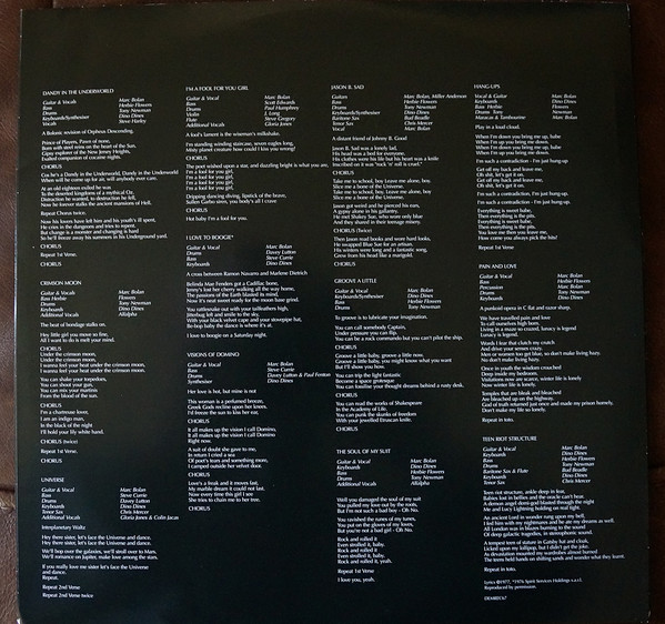 Inner sleeve with Bolan’s face on one side and the lyrics on the other.