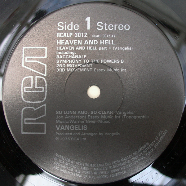 Side 1 has 3 bands and 5 tracks listed: Bacchanale; Symphony To The Powers B; 2nd Movement; 3rd Movement. Side 2 has 6 bands. A Way not part of Heaven And Hell. 5 Tracks listed. Matrix numbers match the original pressing cat. no,. RS1025.
