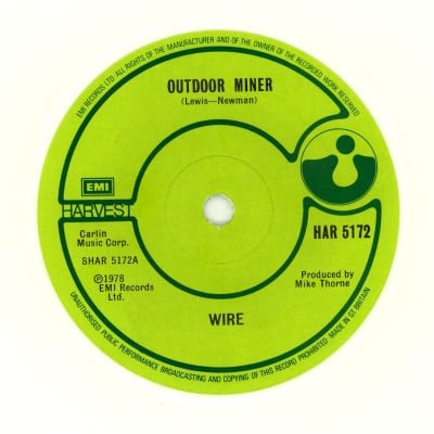 Side A is a different version of “Outdoor Miner” to the one on the “Chairs Missing” album and features a piano solo from producer Mike Thorne.